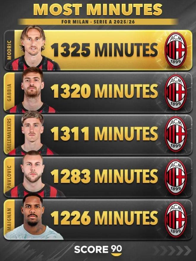 米兰圈Score90统计了米兰球员本赛季意甲出场时间,并列出榜单,40岁莫德里奇1325分钟居首,他仅有25分钟未在场上。